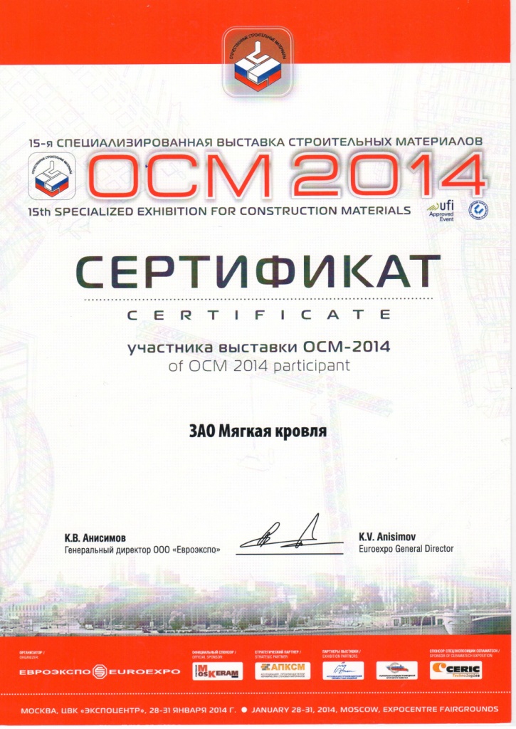 Завод «Мягкая кровля» отмечен дипломом специализированной выставки «ОСМ – 2014».