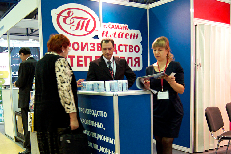 На стенде самарских заводов «Мягкая кровля» и «ЕТ-Пласт» был представлен широкий ассортимент кровельных, гидроизоляционных и теплоизоляционных материалов: